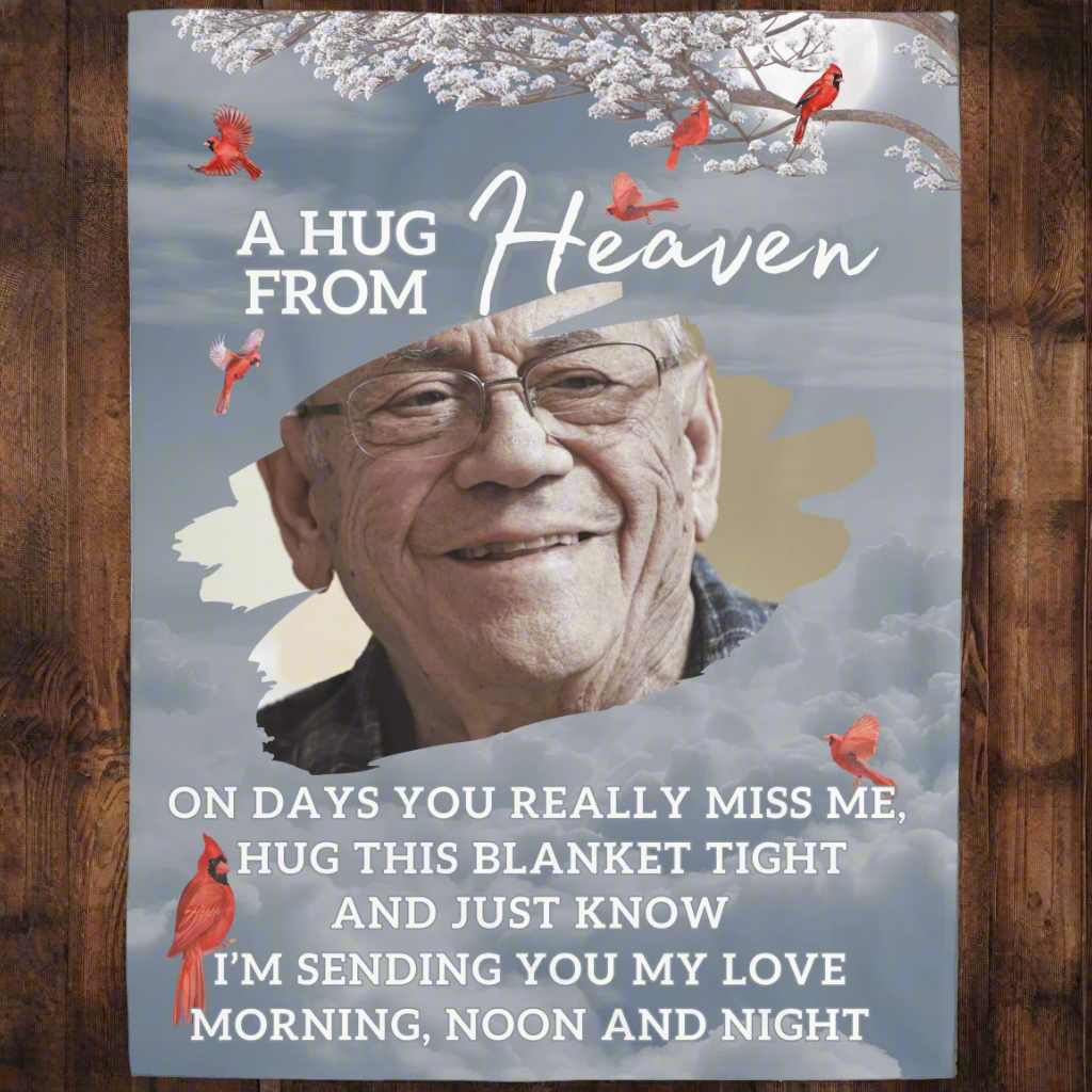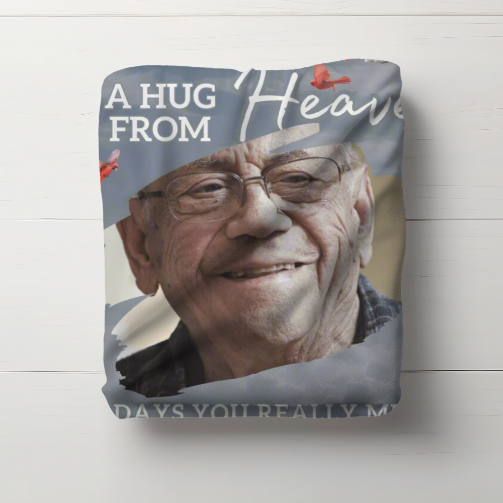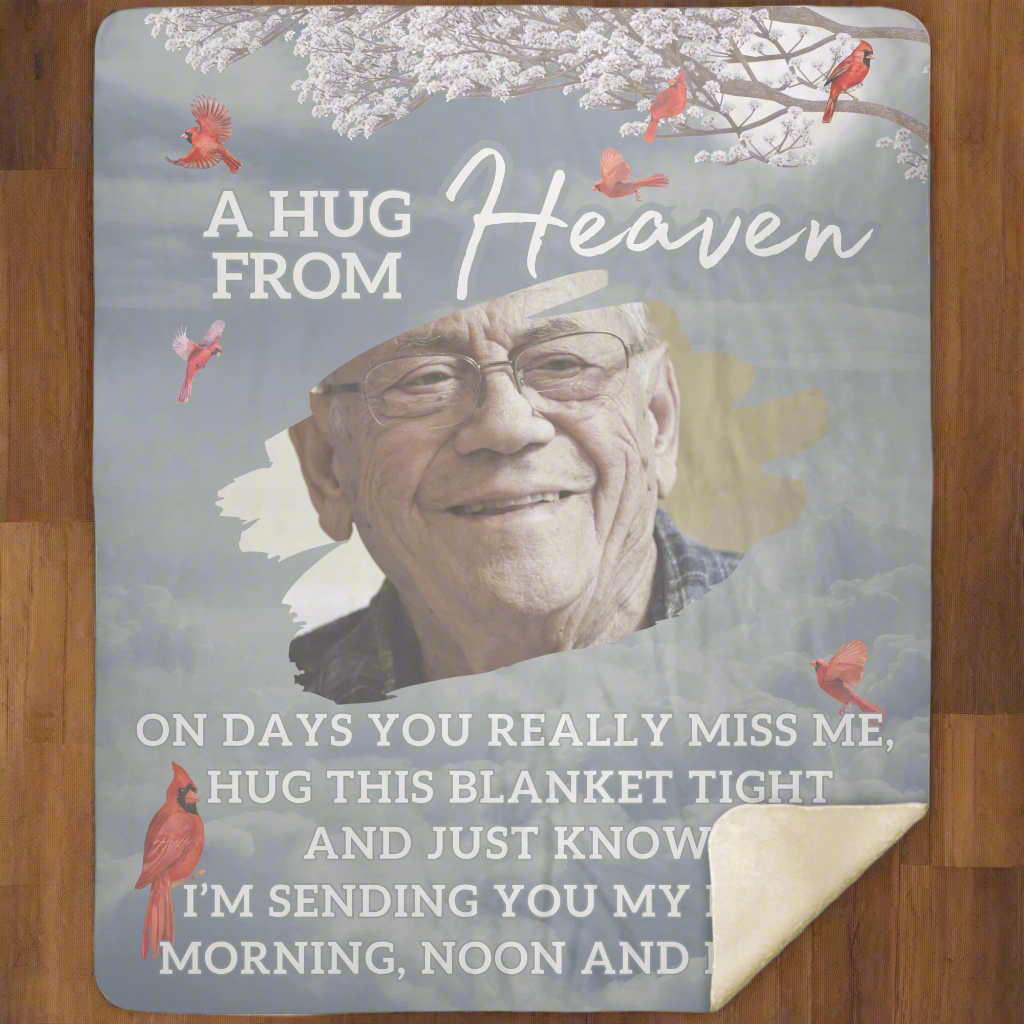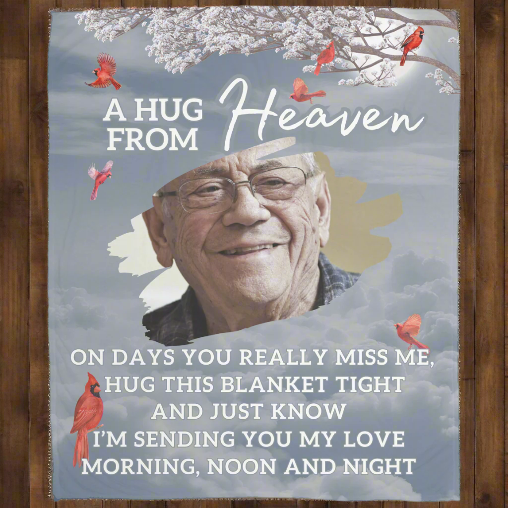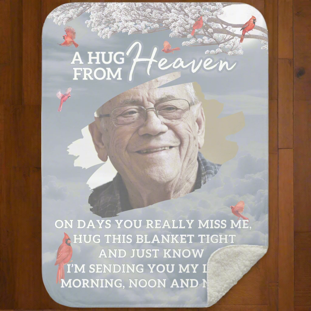Wrap yourself or a loved one in the warmth of cherished memories with this beautifully crafted personalized memorial fleece blanket. Featuring a custom photo and heartfelt message, this blanket offers comfort and solace during difficult times. Its ultra-soft fleece fabric ensures cozy embraces while serving as a meaningful tribute to those we hold dear. Perfect as a thoughtful gift or a keepsake to honor a loved one’s memory, this blanket is a true "Hug from Heaven."