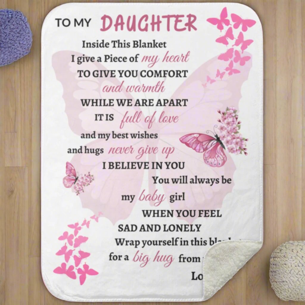 Wrap your daughter in warmth and love with our Pink Butterfly Blanket, a perfect gift that speaks from the heart. This soft, cozy fleece and sherpa blanket is designed to remind her of your love every day, featuring a stunning pink butterfly design and an inspiring message she can cherish forever.