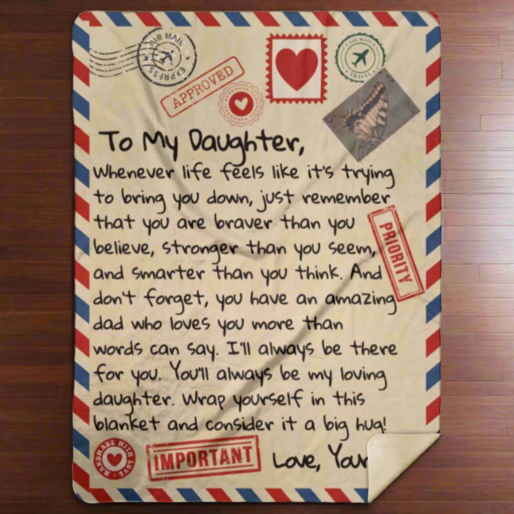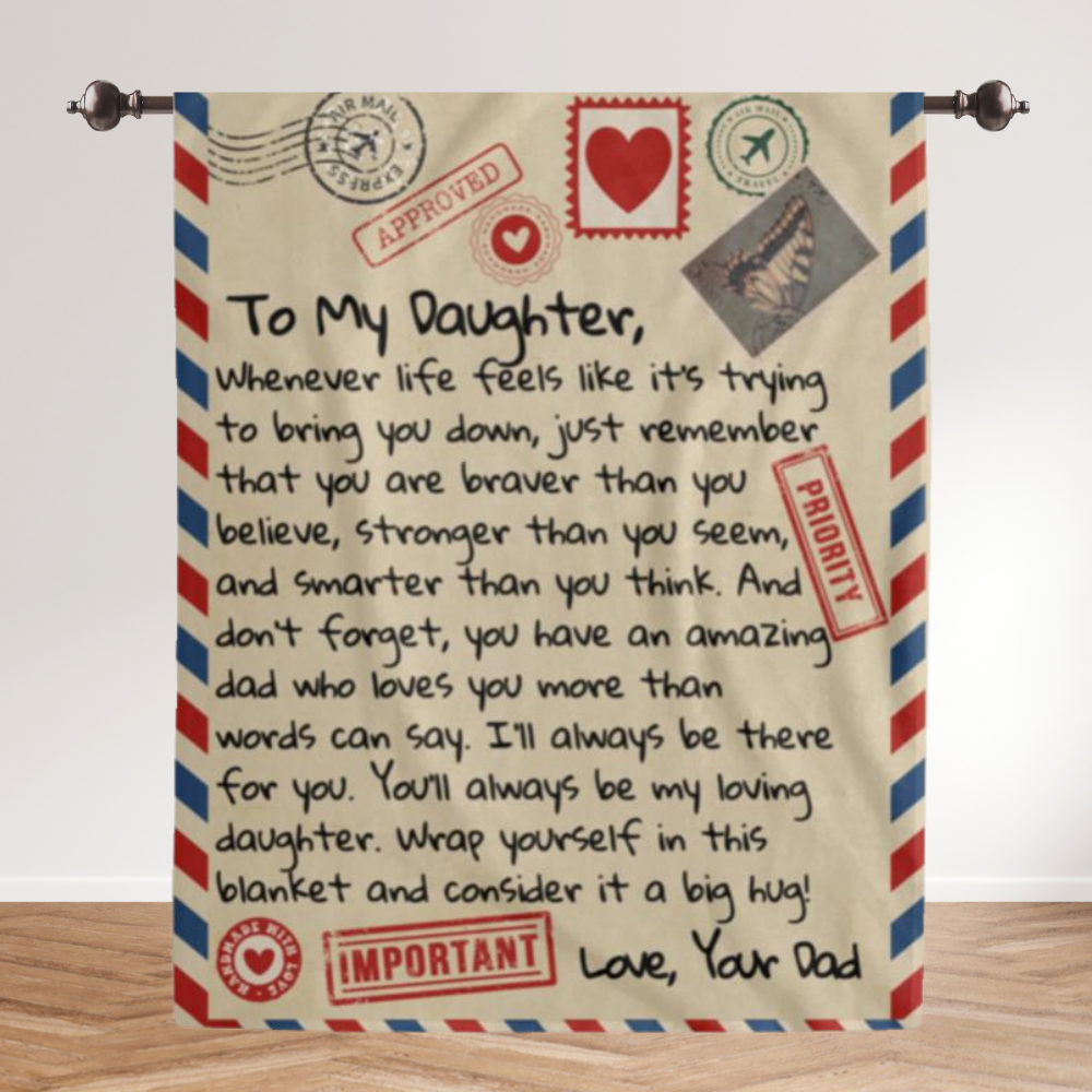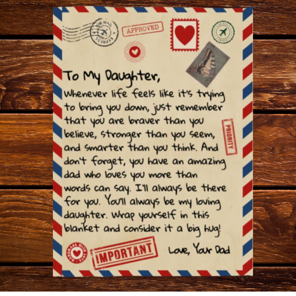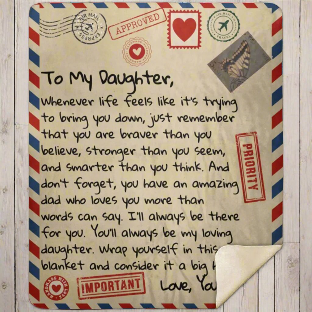 "To My Daughter, Whenever life feels like it’s trying to bring you down, just remember that you are braver than you believe, stronger than you seem, and smarter than you think. And don’t forget, you have an amazing dad who loves you more than words can say. I’ll always be there for you. You’ll always be my loving daughter. Wrap yourself in this blanket and consider it a big hug! Love Your Dad"