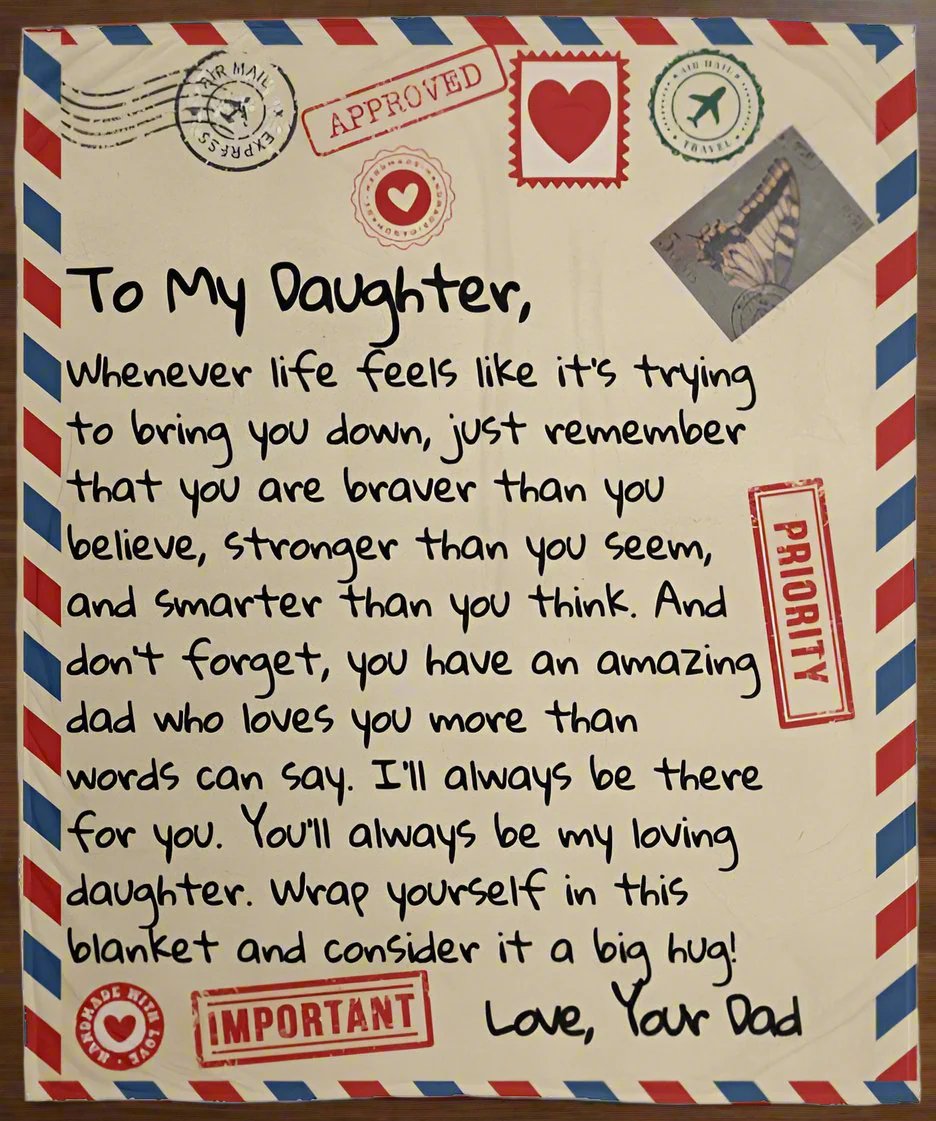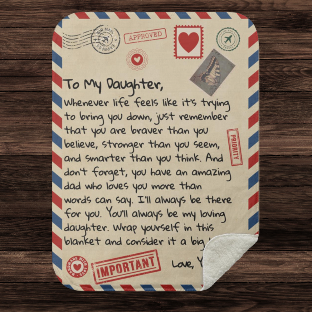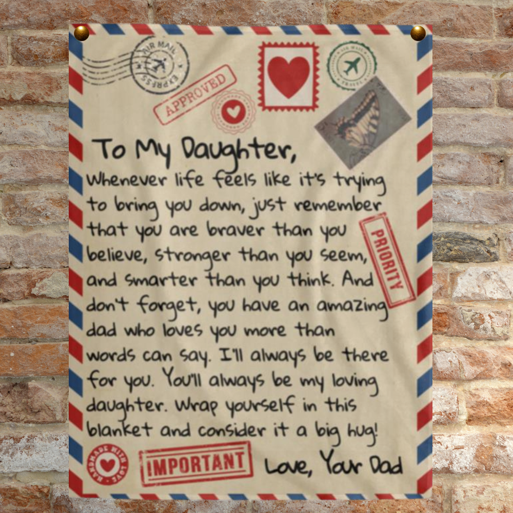 "To My Daughter, Whenever life feels like it’s trying to bring you down, just remember that you are braver than you believe, stronger than you seem, and smarter than you think. And don’t forget, you have an amazing dad who loves you more than words can say. I’ll always be there for you. You’ll always be my loving daughter. Wrap yourself in this blanket and consider it a big hug! Love Your Dad"